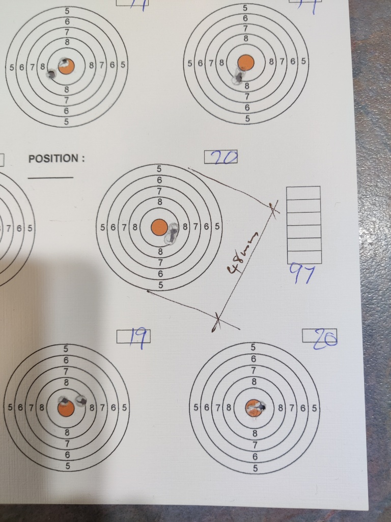 Following up on my earlier comments I managed some pretty reasonable results today at the range using the RWS Superdomes that had impressed in my initial testing. The gun was my new HW30 with 80 shots through it prior to today. It's putting out a consistent 7ftlbs. Targets are 48mm OD, ten targets per card with two shots per target over 25yds - indoors. Here's images of the best portions of each of the two cards shot. The single holes contain two shots. I've since tweaked the trigger a bit more to reduce trigger pull so hopefully I'll be able to do a bit better than this at Saturday's shoot. ![]() ![]() Edited by KiwiTR6 - 2 hours 35 minutes ago at 8:25pm |