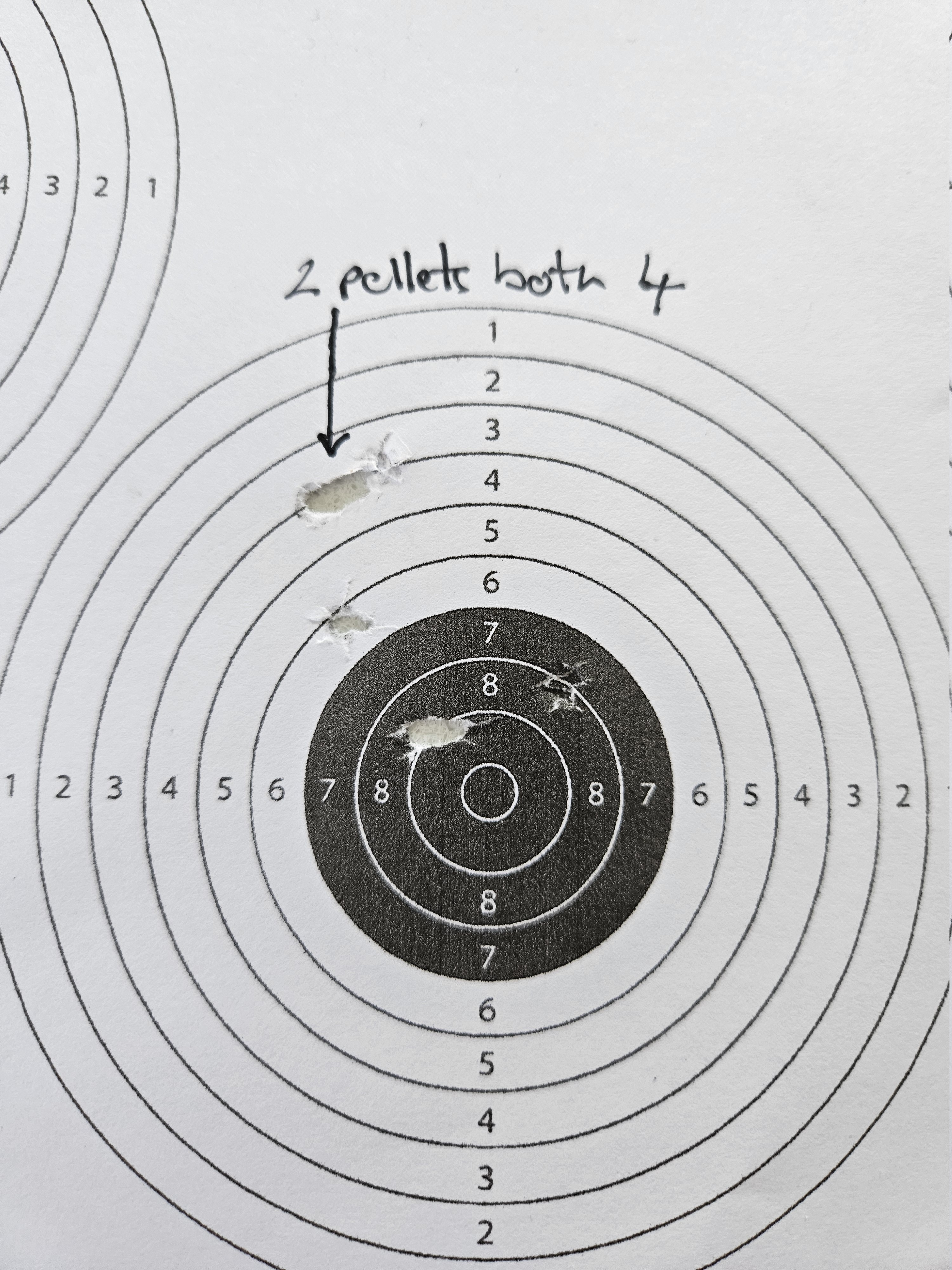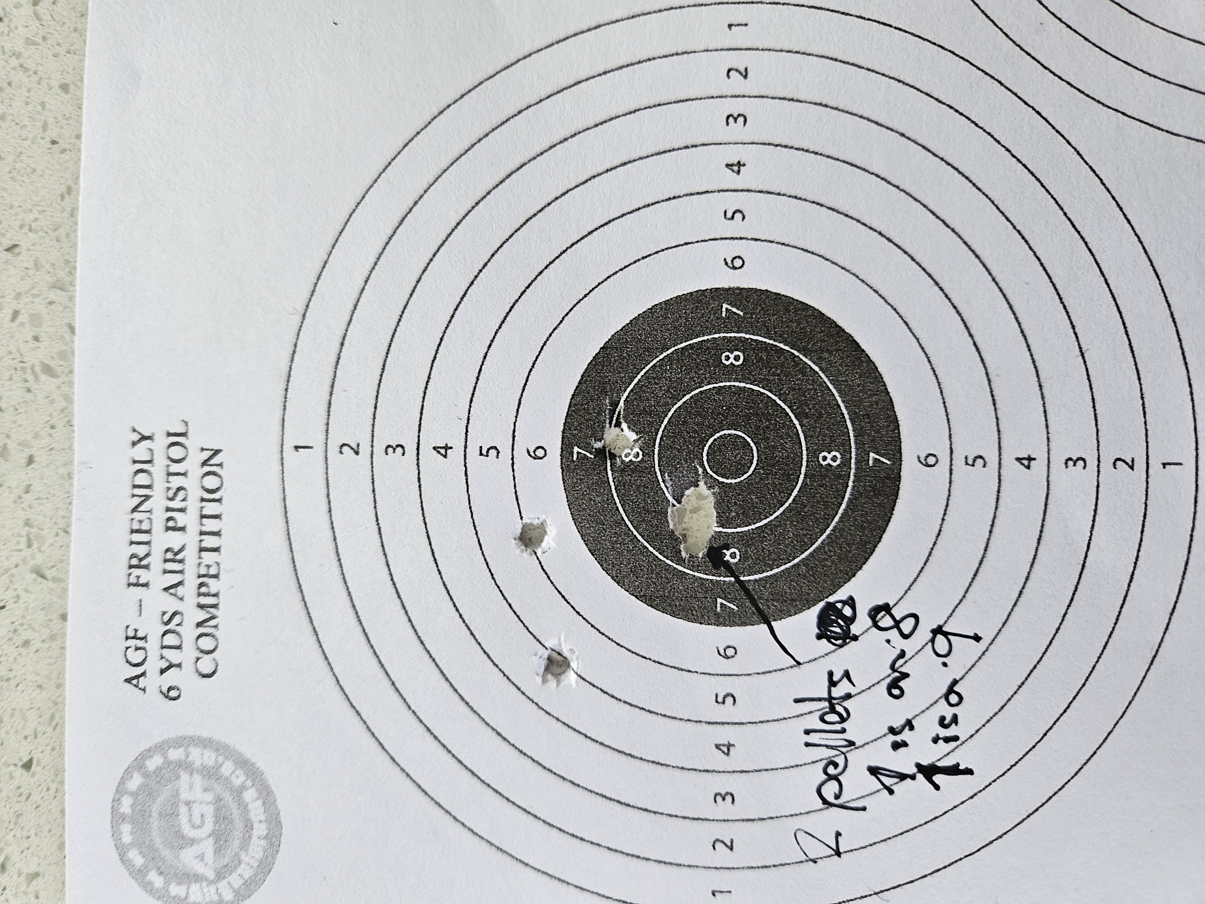 I had a quick go to see if I can work around a packed garage. I have just over 5m for comfortable range. I hadn't printed targets yet as so busy at work, but have these half arsed attempt at DIY splatter targets. The target was against a ply board and low powered pellet didn't even penetrate but you can see the impact. group size 58 mm. Hope to have targets printed and will participate properly this weekend. ![]() |