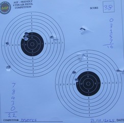 That's  pretty impresive Mercs!   I did get a bit of time yesterday for more testing with my pistol on some 3 inch splater targets I have.  Re-testing JSB exacts as they SHOULD be better than the Apolos.  Still more a  gathering than a groupng and  still shooting high.   Should get time over the next few days for more testing with both pelllets I have and if I can either get a consitent aim point or adjust the sights to shoot lower at 6 yards I will shoot another target. As for the discuson around scoring - my understanding is that if you break the line you score the higher score.  As for 10.1 for a perfect bull - while I have heard of this, I don't beleive we need go this far.  As  Pauly said- a 10 is a 10.  Hell in my case I'd be happy to break the line on a 10  once across 10 shots with my pistol! While I am competitive,  I'm mostly competitive with myself. I shot a 67 with my first target and I want to do better next time.  I'm interesed in what every one else is doing and very impressed with Mercs latest effort, but I'm not going to argue that a paticular shot is an eight or a nine or get miffed because others are scoring higher than me.  For me it's  all about being out there doing it - and the more that are involved the better - so get those pistols out and start shooting! | |