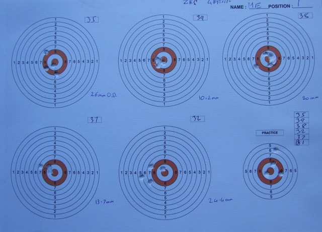 The 100% lead free has a cost. H&N FTT Green $35 per tin (200) = 17.5 cents each H&N FTT Lead $20 per tin (250) = 8 cents each I found the Green pellets cleaned or stripped the bore requiring leading in of subsequent pellets. At greater distance the accuracy quickly deteriorates. With higher shot counts the accuracy deteriorates. Tin is labelled "For PCP rifles only" and I have requested an explanation from H&N. Web site has the green alloy containing tin, zinc, iron and plastic. Outdoors 20 yards, poor conditions with light rain and breeze from right. Norica ZRS using Zero Tech Vengeance scope on 16 power. Pellet H&N FTT Green 0.62g 5.50mm 3 shot group 11.94mm OD ![]() Outdoors 20 yards, poor conditions with light rain and breeze from right. Norica ZRS using Zero Tech Vengeance scope on 16 power. Pellet H&N FTT 0.95g 4.53mm 3 shot group 11.41mm OD ![]() 25 yards indoors practice session, inward scoring 4 shot groups with measured OD. Mixed results and not competitive with several other springer users shooting 200's. POA centre with no correction, the lighter pellet may actually need a different rifle or technique. ![]() I will check at higher velocity and undertake chronograph checks.